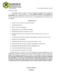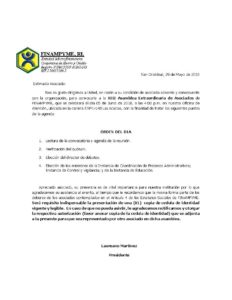 Reciban un afectuoso saludo en nombre propio y en el de la Asociación Cooperativa de Ahorro y Crédito «FINAMPYME, R.L.»; adjunto a la presente Convocatoria para la XIX Asamblea Ordinaria de Asociados y la XIII Asamblea Extraordinaria de FINAMPYME, que se celebrarán el día 05 de Junio del 2018, a las 2:30 p.m. y 4:30 pm, respectivamente, en nuestra Oficina de Atención de Las Acacias. Esperamos contar con su presencia, en caso de no pueda asistir le agradecemos llenar el formato anexo de «Poder» y remitirlo por esta vía para ser representado en dicha Asamblea.